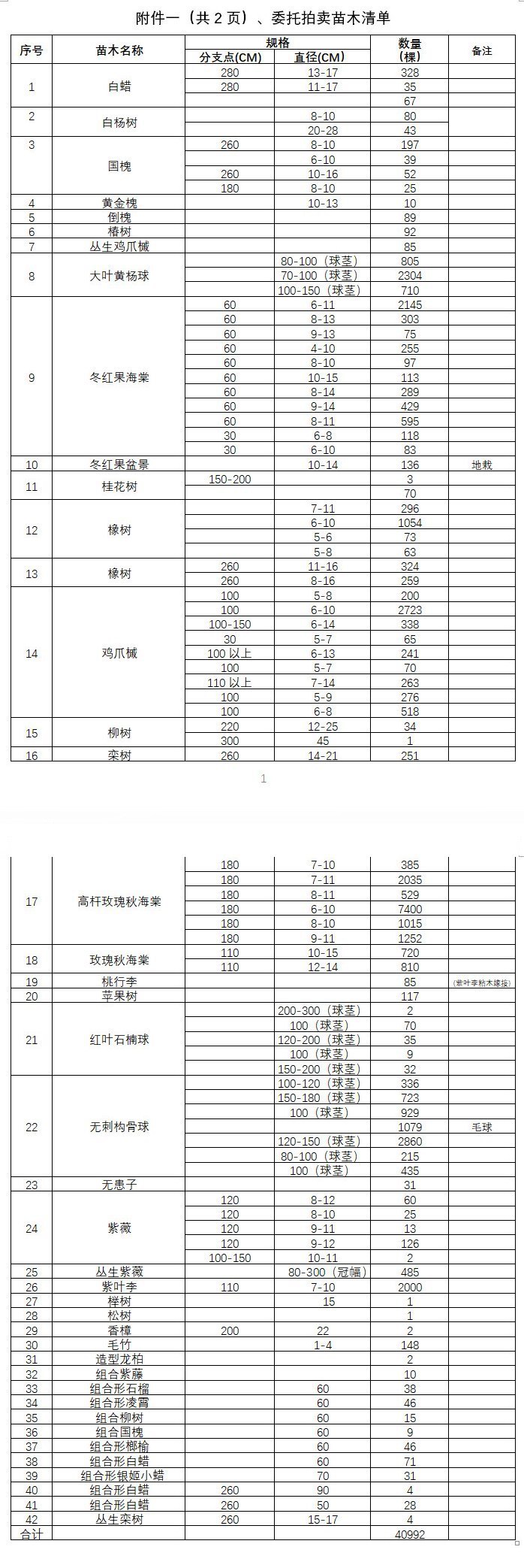標的概況 | 1、苗木基地內(nèi)的白蠟、國槐、大葉黃楊球、冬紅果海棠、桂花樹、橡樹、玫瑰秋海棠、雞爪槭、蘋果樹、紅葉石楠球、無刺構(gòu)骨球、紫薇、香樟等42種苗木,約40992棵,苗木的品種、規(guī)格、數(shù)量等詳見附件一《苗木清單》。 2、門衛(wèi)、水泥路、配套房屋、豬圈、小橋、圍欄、深水井等15項配套設(shè)施,詳見附件二《配套設(shè)施清單》。 |